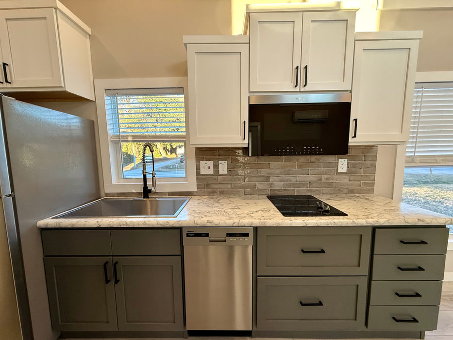 Stainless steel sink, laminate countertops, and ceramic backsplash