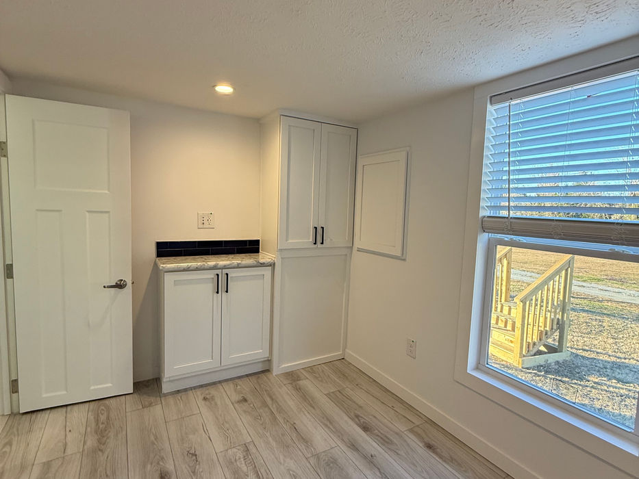 Smooth sheetrock walls, textured ceilings, and Craftsman-style trim
